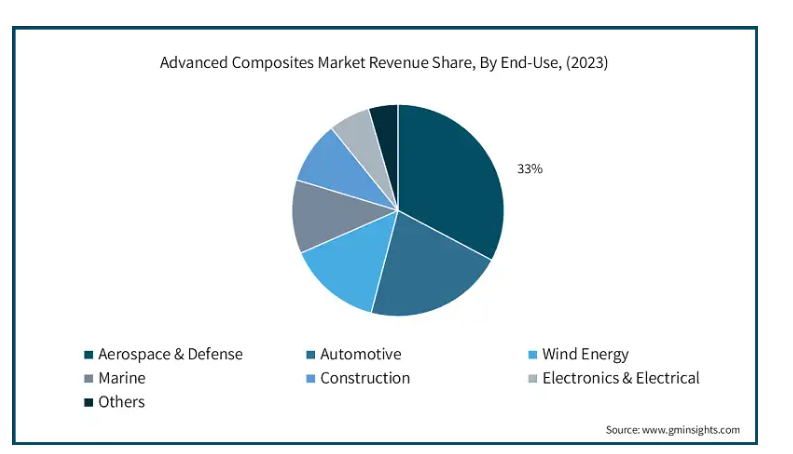 高い強度対重量比と耐久性により、先端複合材料は航空宇宙および防衛産業で高い需要があります。これらの複合材料は、航空機の胴体、翼、内装部品で重要な役割を果たしており、軽量化、燃料消費の削減、メンテナンスコストの削減につながります。特に民間航空セクターにおける航空需要の増加に伴い、これらの複合材に対する需要は拡大する傾向にあります。