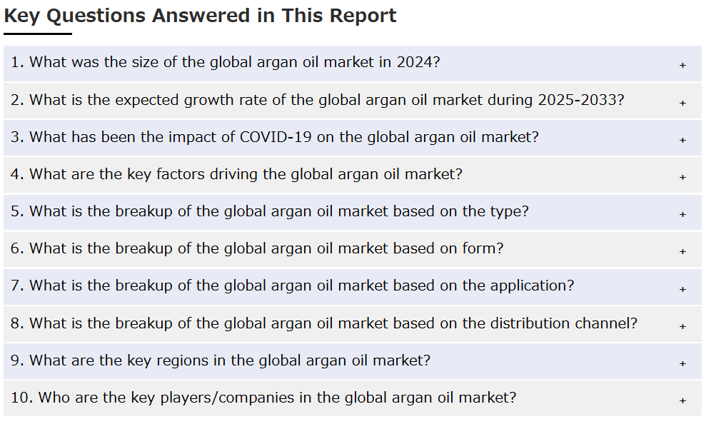 世界的なアルガンオイル市場は、主に化粧品業界と食品・飲料業界での利用拡大によって牽引されています。アルガンオイルは、世界中でさまざまな焼き菓子や乳製品、冷菓の製造に広く使用されています。さらに、医薬品や栄養補助食品の製造におけるアルガンオイルの普及も市場の成長を後押ししています。アルガンオイルは、抗炎症、抗増殖、抗酸化、鎮痛などのさまざまな特性を示し、それにより、皮膚関連やその他の疾患の治療薬や医薬品の製造に広く使用されています。さらに、リサイクル可能な容器に詰められたオーガニックアルガンオイルの発売など、さまざまな製品イノベーションも、成長を促す要因となっています。これに伴い、持続可能な栽培とオイルの調達のために、バイオベースの肥料、緑肥、骨粉、堆肥肥料を使用して収穫されています。その他にも、アロマセラピーでのアルガンオイルの使用が増えていることや、消費者の購買力が高まっていることなど、さまざまな要因が市場をさらに牽引すると予想されています。