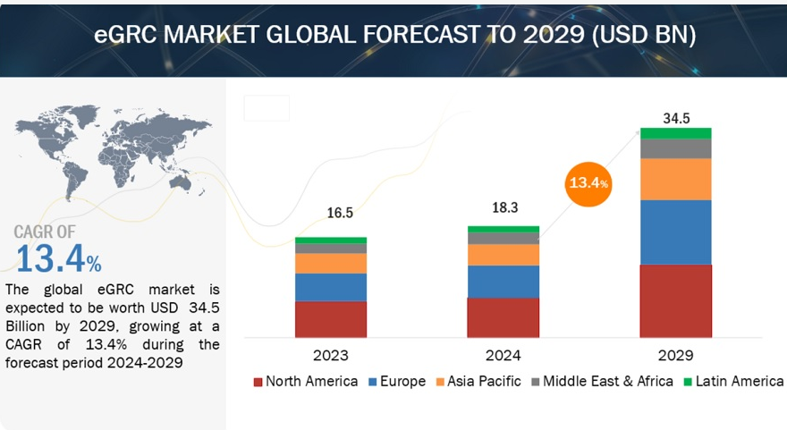 eGRCの市場規模は、2024年の183億米ドルから2029年には345億米ドルに成長し、予測期間中の年間平均成長率(CAGR)は13.4%になると予測されている。eGRCの主な原動力は、ステークホルダーからの透明性と説明責任に対する要求の高まりである。社会の期待が進化するにつれて、投資家、顧客、規制機関を含むステークホルダーは、倫理的なビジネス慣行、持続可能性への取り組み、企業責任を重視するようになっている。eGRCソリューションは、透明性と報告メカニズムを強化することで、ガバナンスの卓越性、リスク軽減、規制遵守に対する組織のコミットメントを示すことを可能にする。強固なガバナンス・フレームワークを導入し、徹底したリスク評価を実施し、コンプライアンス要件に積極的に対処することで、組織は信頼を築き、ステークホルダーとの長期的な関係を育み、市場での評判を高めることができます。