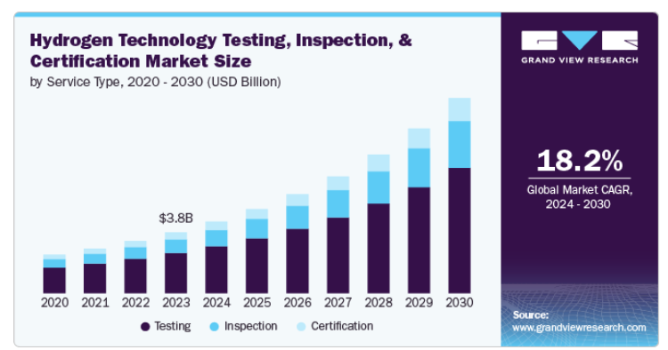 検査分野は、今後数年間で大きな成長が見込まれます。水素の生産、貯蔵、輸送システムの拡大に伴い、漏洩、構造的欠陥、機器の故障などのリスクを防ぐために定期的な検査が不可欠です。水素充填ステーション、パイプライン、産業用アプリケーションの増加により、継続的なモニタリングと進化する安全基準へのコンプライアンスの必要性が高まっています。さらに、エネルギー、自動車、製造などのセクターにわたる厳格な規制枠組みや業界固有の要件が、急速に拡大する水素経済における運用の安全性と信頼性を確保するための専門的な検査サービスへの需要を促進しています。