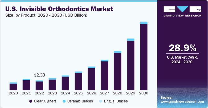 インビジブル矯正歯科の世界市場規模は2023年に61億米ドルと推定され、2024年から2030年まで年平均成長率(CAGR)28.5%で成長すると予測されている。不正咬合の患者人口が急速に増加していることが、市場成長の主な要因である。WHOによると、不正咬合は歯周病、う蝕に次いで世界的に3番目に多い歯科疾患である。不正咬合の有病率は非常に多様で、小児と青少年では39%から93%と推定されています。見えない矯正歯科に対する需要の高まりと歯科医療における急速な技術進歩は、予測期間中の市場成長を促進すると予想される要因である。