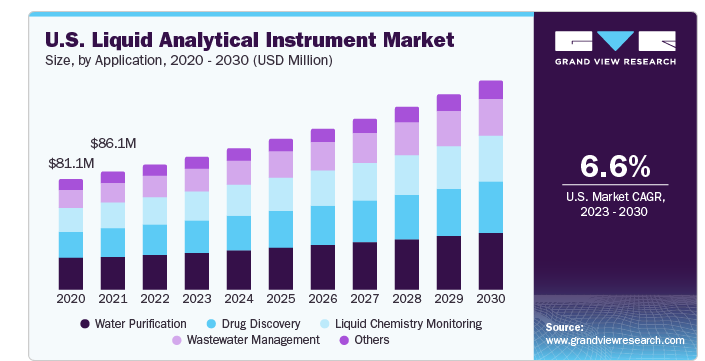 液体分析装置の世界市場規模は2022年に4億4620万米ドルとなり、2023年から2030年にかけて年平均成長率(CAGR)5.6%で成長すると予測されている。処理コストの削減と不適合廃棄物の削減を目的とした液体分析装置への需要の高まりが、予測期間中の市場を牽引すると見られている。上下水道管理業界における水質検査のための製品需要の高まりにより、市場は予測期間中に大幅な成長が見込まれる。さらに、厳しい環境規制や政府規制が、多くの最終用途産業における液体分析機器の採用を促進している。