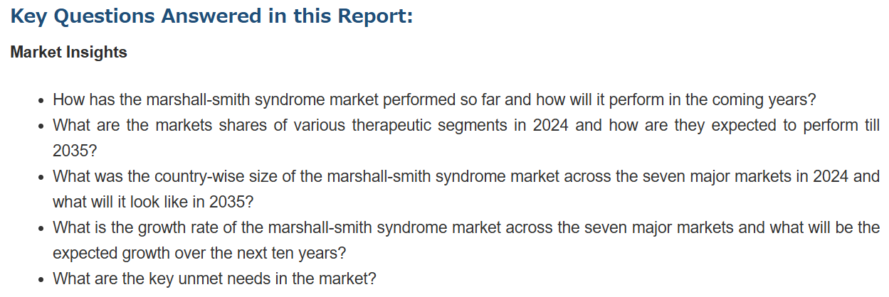 IMARC Groupの最新レポートは、米国、EU4(ドイツ、スペイン、イタリア、フランス)、英国、日本におけるマーシャル・スミス症候群市場の徹底的な分析を提供しています。これには、治療方法、市場、パイプラインの薬剤、個々の治療法のシェア、7つの主要市場における市場実績、主要企業およびその薬剤の市場実績などが含まれます。また、本レポートでは、7つの主要市場における現在の患者数と将来の患者数も提供しています。さらに、現在の治療方法/アルゴリズム、市場の推進要因、課題、機会、償還シナリオ、未充足の医療ニーズなども報告されています。本レポートは、メーカー、投資家、事業戦略家、研究者、コンサルタント、およびマーシャル・スミス症候群市場に何らかの利害関係を有する方、または何らかの形でマーシャル・スミス症候群市場への参入を計画している方にとって必読のレポートです。