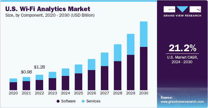 ソフトウェアセグメントが市場をリードし、2023年の世界売上高の66.0%以上のシェアを占めている。Wi-Fiアナリティクスソフトウェアは、エンドユーザーのWi-Fiネットワークの可視性を向上させるCPE(Customer Premise Equipment)統合型のコスト効率に優れたプラットフォームである。これにより、企業は収集したデータを既存のデータセットと統合し、業務全体をシームレスかつ全体的に把握することができる。さらに、運用コストを削減し、エンドユーザーのサポート体験を向上させる。このように、複数の企業による位置情報、マーケティング、広告Wi-Fi分析ソフトウェアの採用が増加していることが、同分野の成長を後押ししている。